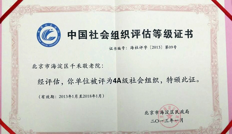 千禾敬老院4A社会组织证书