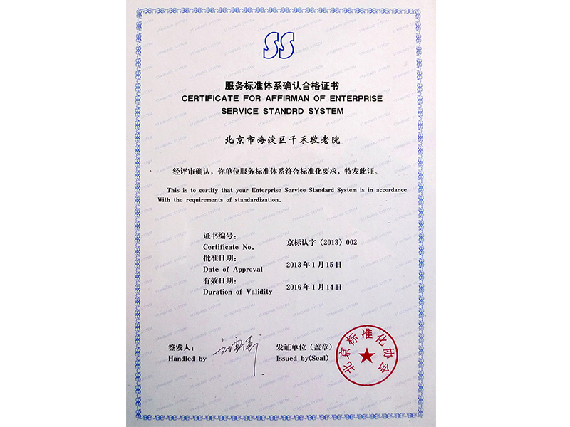 服务标准体系确认合格证书