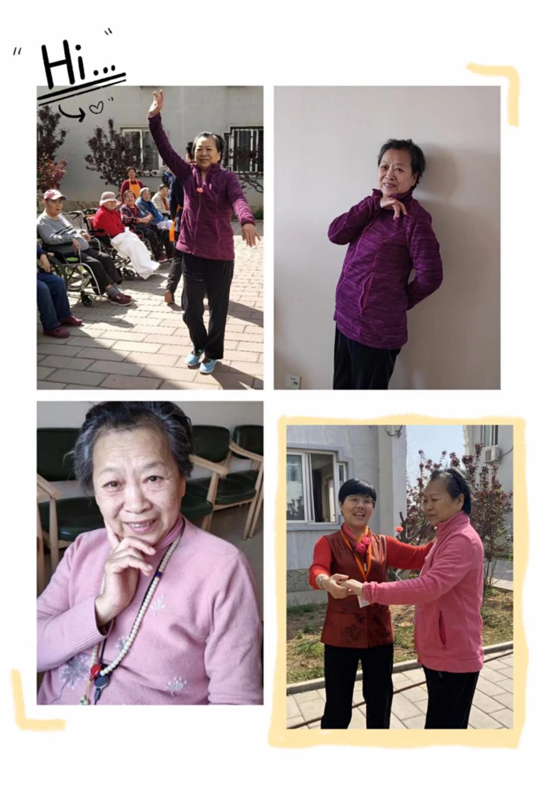 入院后,我们了解到徐阿姨年轻时是一位幼儿园老师,后来积极参加教会唱诗班,特别喜欢唱歌跳舞,还会音乐指挥,简直是多才多艺。对于老人来说,一定要发挥她的生命活力,才有利于恢复健康。于是每逢院里有文娱活动,我们投其所好,有意请徐阿姨当教练,让她带着我们唱歌、跳舞,果不其然,一投入状态,徐阿姨就像变了一个人。她由最初的被动到现在的主动,如今一到文娱活动时间,音乐声一响,变成了启动徐阿姨生命活力的按钮,她就会喜笑颜开,翩翩起舞。