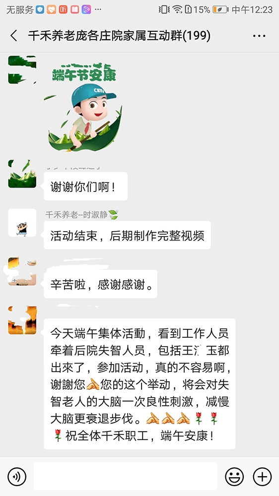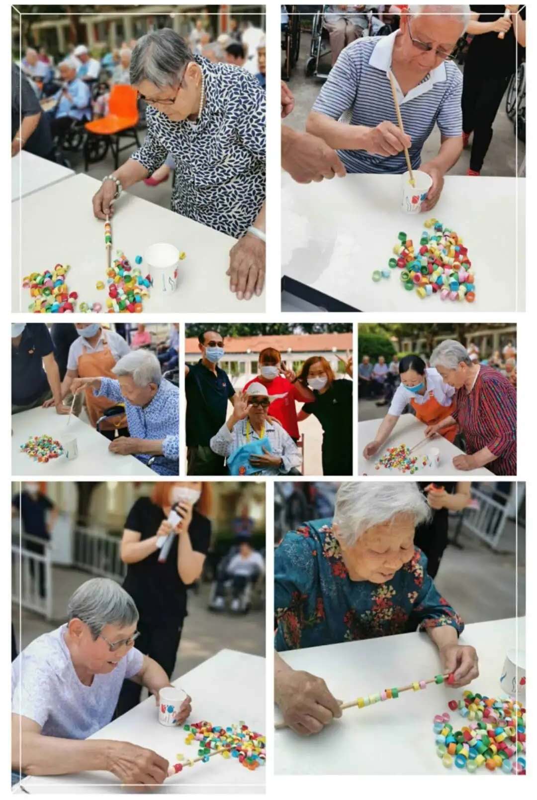 今天我们不仅仅是包粽子吃粽子哦,还特意准备了好玩的游戏和贴心的礼物等着爷爷奶奶们一起参与。串彩环是给爷爷奶奶们设计的好玩活动,既锻炼眼力,也锻炼两手的配合,爷爷奶奶们一个个睁大眼睛,玩得专心致志。五彩缤纷的小珠子,串起了爷爷奶奶们的快乐心情。