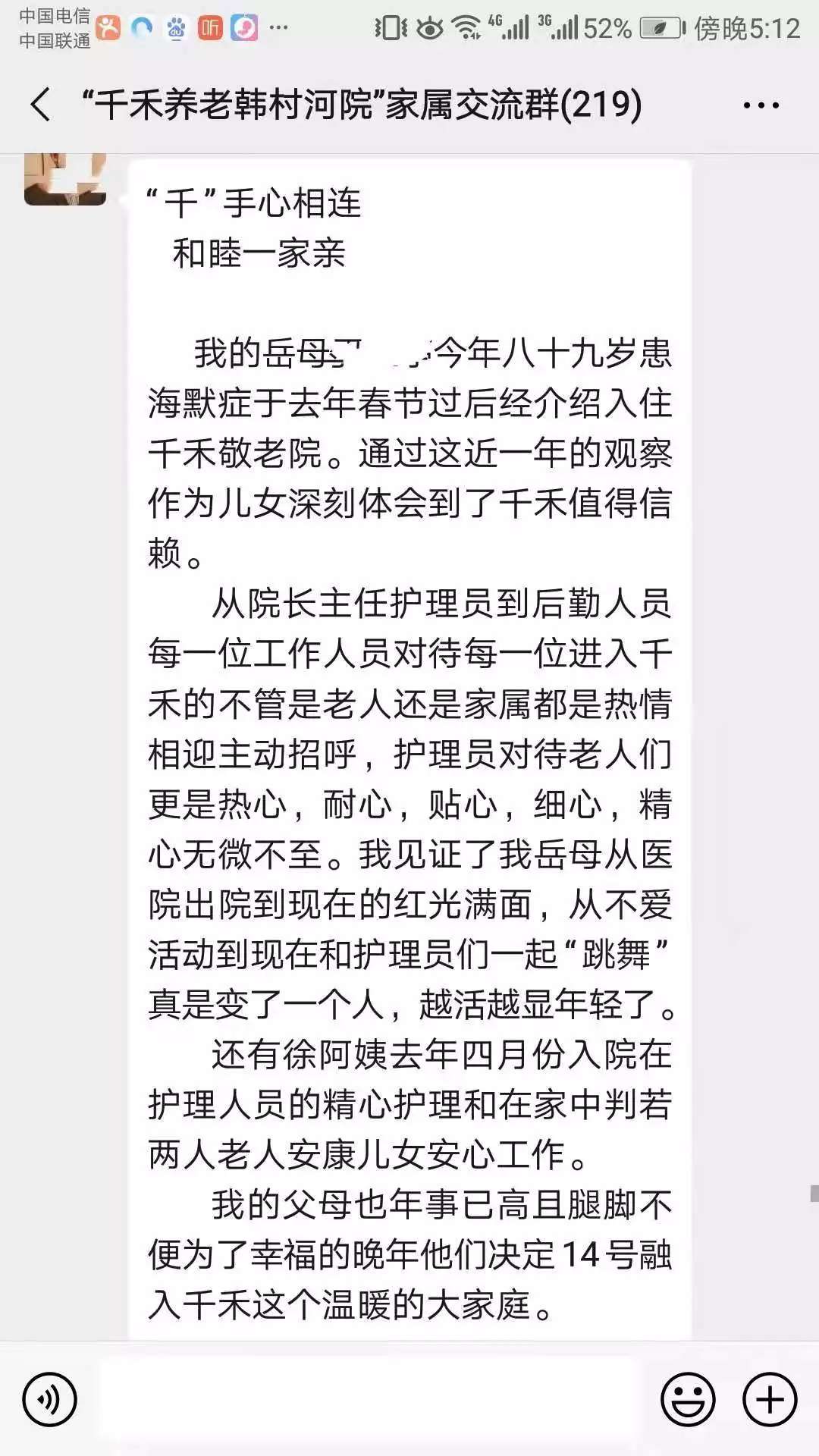 北京品质生活栏目也联系到入住老人的家属做为采访对象,一位是于奶奶的女婿刘先生。刘先生说,于奶奶今年89岁,2018年2月份经朋友介绍入住千禾,至今已有两年,于奶奶入院时患有轻度阿尔兹海默病。刚开始入住千禾,老人还有一些不适应,千禾的护理员尝试通过抚触、香薰、音乐、认可等疗法,用同理心的方式去照顾于奶奶,让于奶奶慢慢融入了千禾的大家庭,现在老人会跟着大家做益智操,还能参与拼图、绘画一些简单的智力游戏。刘先生看到岳母的变化,在2020年初,把自己的父母也送到千禾养老韩村河院,三位老人经常聚在一起愉快地聊天、做活动。以下是刘先生在家属群的留言。