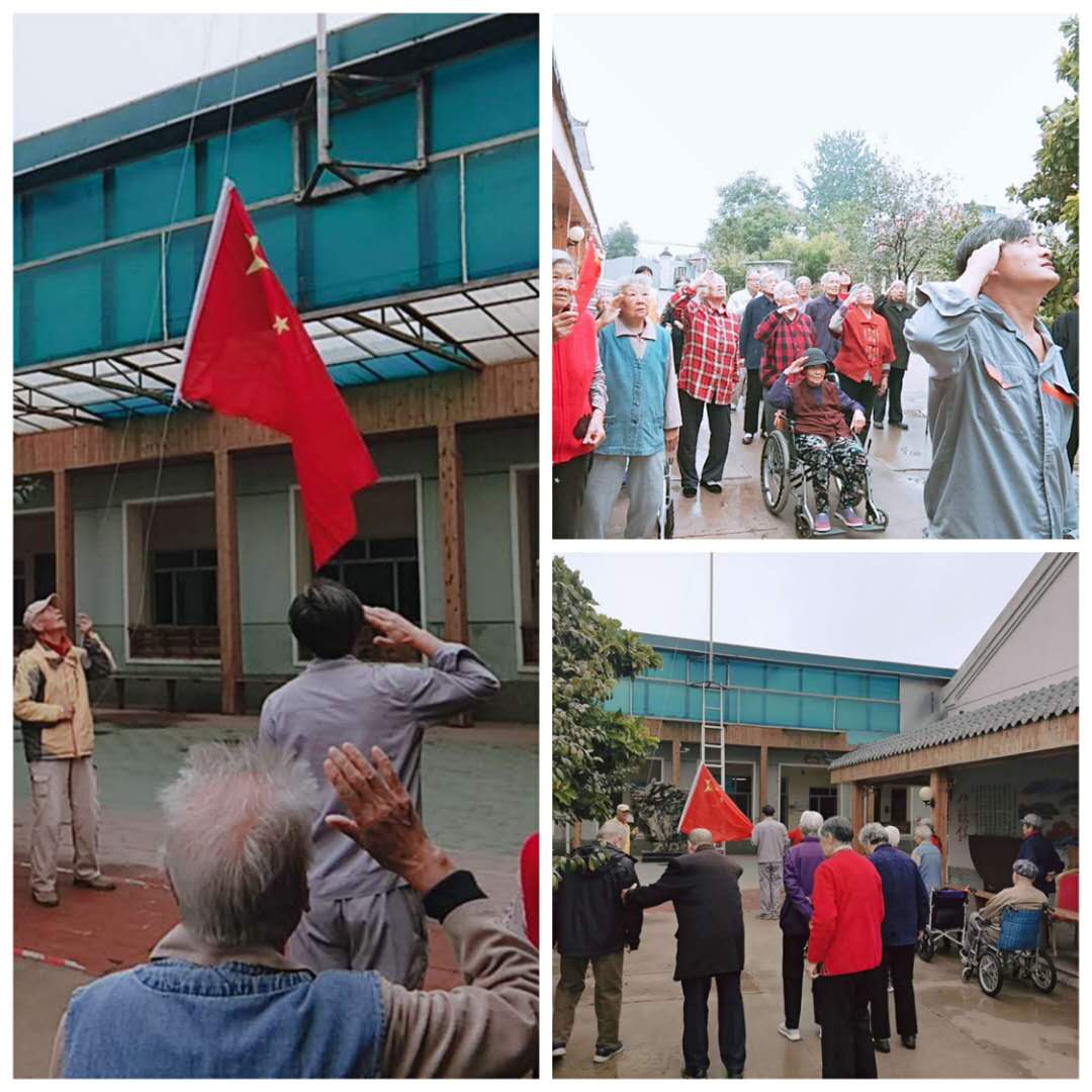 一大早,工作人员和爷爷奶奶们相聚一起,进行升旗仪式。伴随着庄严的国歌声响起,爷爷奶奶和工作人员们不约而同地向国旗行礼,神情专注而庄重。“起来,不愿做奴隶的人们……”嘹亮的歌声唱出了在场所有人对祖国的一片深情!