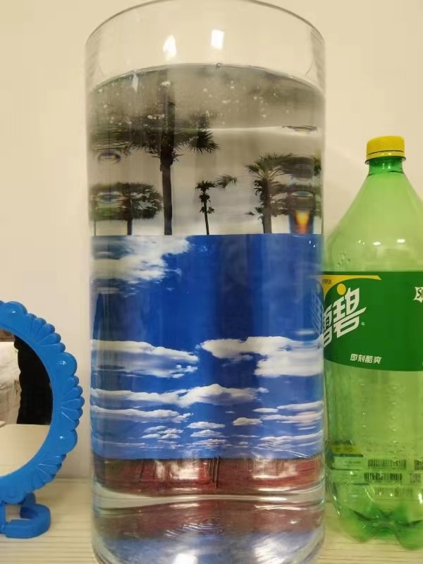 桌子上放着一个圆柱玻璃桶,我以为是个什么摆设,近看里面是清水,原来是用来自然蒸发成湿气的。阿姨敲敲玻璃桶,笑:“你看看里面呀!多么碧绿又辽远的草原,多么湛蓝的天空,多么洁白的云朵!美不美?”我啧啧赞叹,又狐疑风景怎么泡到水里的?转一圈,才发现水里映衬着的美丽风景来源于玻璃桶背后的墙上贴的一张小小画纸,阿姨得意极了:“这奇幻风景是我设计的!”