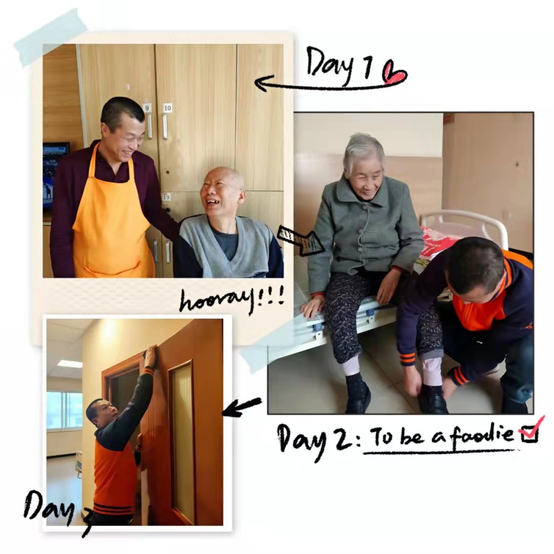 给鞠师傅印象最深同时也最有启发的是汤阿姨和徐阿姨。她俩都患有阿尔兹海默病,刚来的时候脾气很大,鞠师傅和其他护理员小心翼翼,常常不知所措,心有余悸。后来鞠师傅了解到两位阿姨喜欢吃甜食,血糖也不高,家属常常送来她们爱吃的小甜品。于是他每次看到阿姨不开心,就像哄小孩一样,往她们嘴里放一块小甜品,阿姨就眉开眼笑了。鞠师傅趁着她们高兴,及时找到她们喜欢做的游戏一起玩起来。汤阿姨喜欢跳舞唱歌,鞠师傅就陪她一起欢唱。