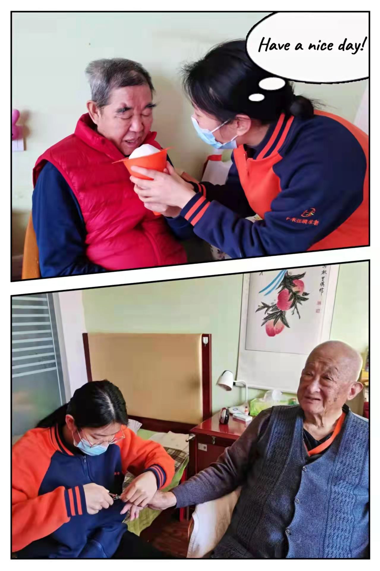 没想到第一天到养老院时,整个氛围让小石头放心了。院里的领导和师傅们对这些年轻的实习生很热情,像自己远道而来的孩子回家了,问长问短,小石头一下子不紧张了。她第一次在养老院吃饭,把漫长旅途的疲劳一扫而空,放下心来,坐在远方的桌子前很有回家的感觉。满满一桌子北方菜,小石头很好奇,尝尝这个,品品那个,味道和家乡菜不一样,但她吃得都很香。这是小石头第一次吃到北方的食物,喔!原来这里只有中午吃米饭,而云南一日三餐少不了米饭,小石头开启了适应北方饮食习惯的准备。来的时候正是冬天,天气很冷,又给小石头一个不一样的体验。因为云南四季如春,北京的冬天出门要多穿衣服,小石头忙着把带来的衣服统统穿上,裹得厚厚的。