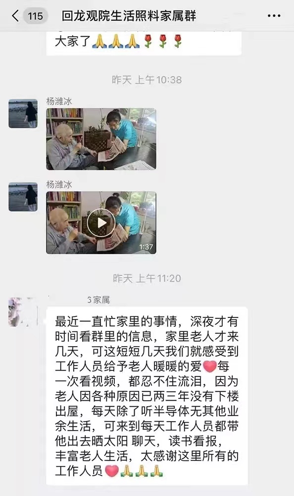 今天我去看赵爷爷,他说想和家里通个电话。我知道爷爷想孙女了,那是他唯一的直系亲属。孙女过几天中考,学习紧张,学校封闭管理,不方便过来看爷爷,上次孙女来看爷爷还是他从医院回来后。当时我考虑到爷爷的心情和身体状况,和家属沟通,和院长商量,力争让爷爷见见孙女,心情好转了,对身体健康也有益。孙女来的那天,赵爷爷精神也好了,我们推着赵爷爷到院门口和家属见面,拍了一张合影留念。自从上次见后,一转眼又快两个月了。