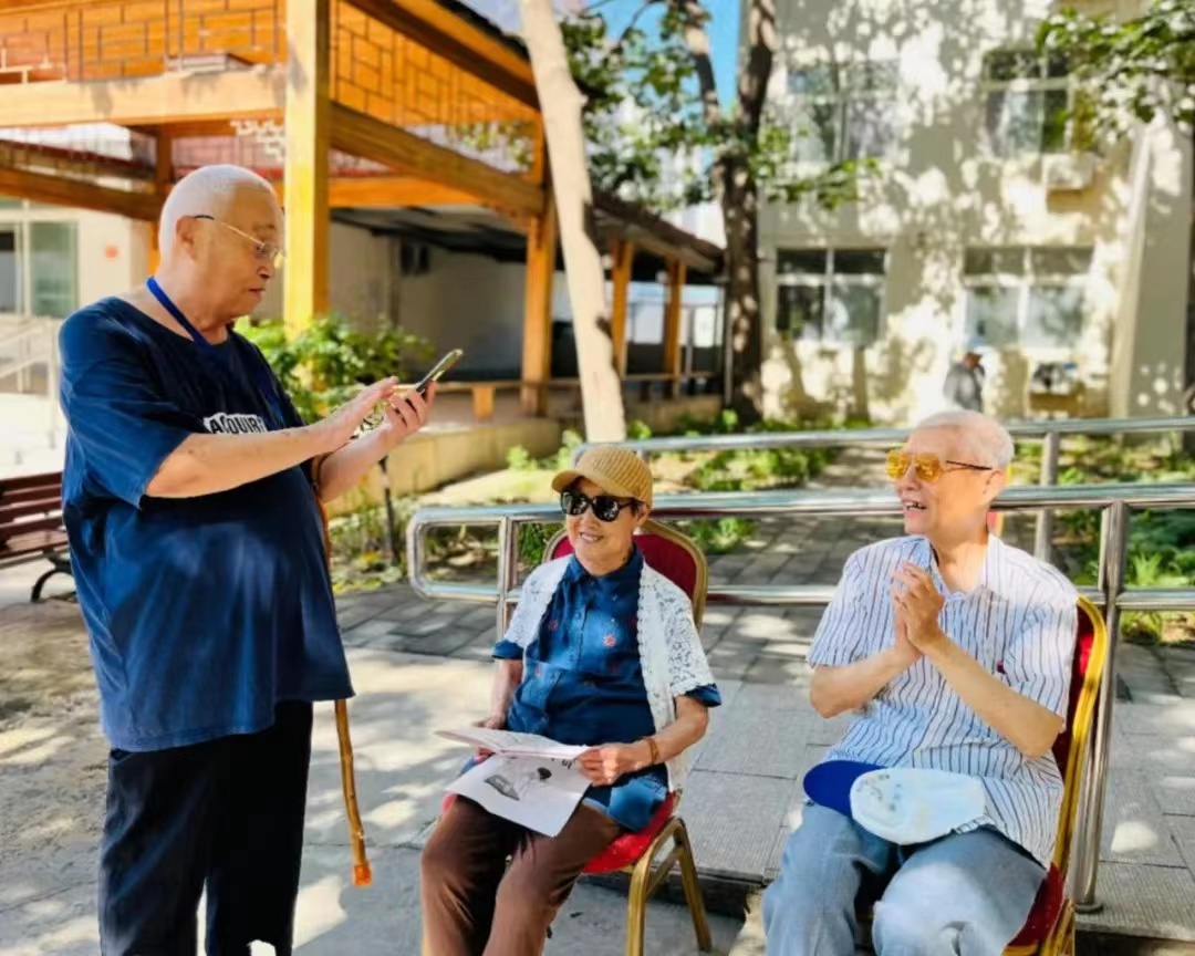 李爷爷打着节拍和黄爷爷一起轻声歌唱。