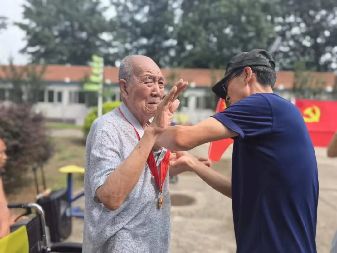 90多岁的于奶奶看到胡师傅出了汗,给她扇扇子。