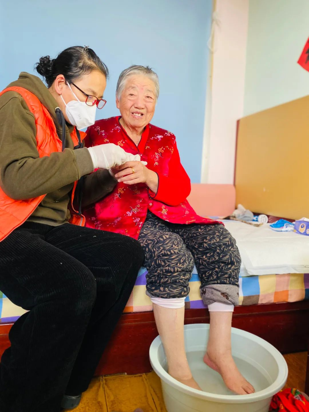 王奶奶特别喜欢张师傅:“小张是我的亲姑娘!”这段时间,大家都处于被新冠感染后的逐步康复期间,张师傅为奶奶按时泡脚,从细节上精心照顾着奶奶的生活。王奶奶看在眼里,疼在心里:“小张,你自己更要注意身体,多休息。”(拍摄时间:2022年12月21日)