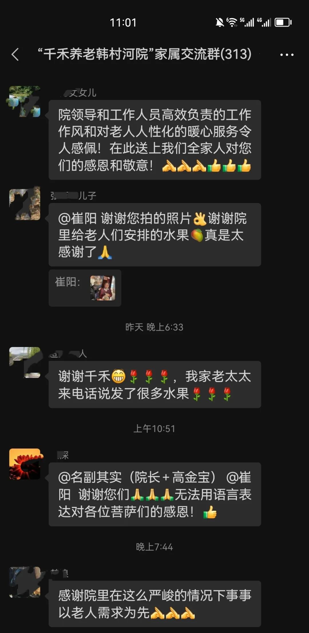 因快递等业务都延迟,家属提出给老人快递物品困难,尤其担心老人吃不到水果而忧心忡忡。院长积极想办法大力协调,为老人团购到新鲜的应季水果,在院内消杀静止后分送到每位老人房间。