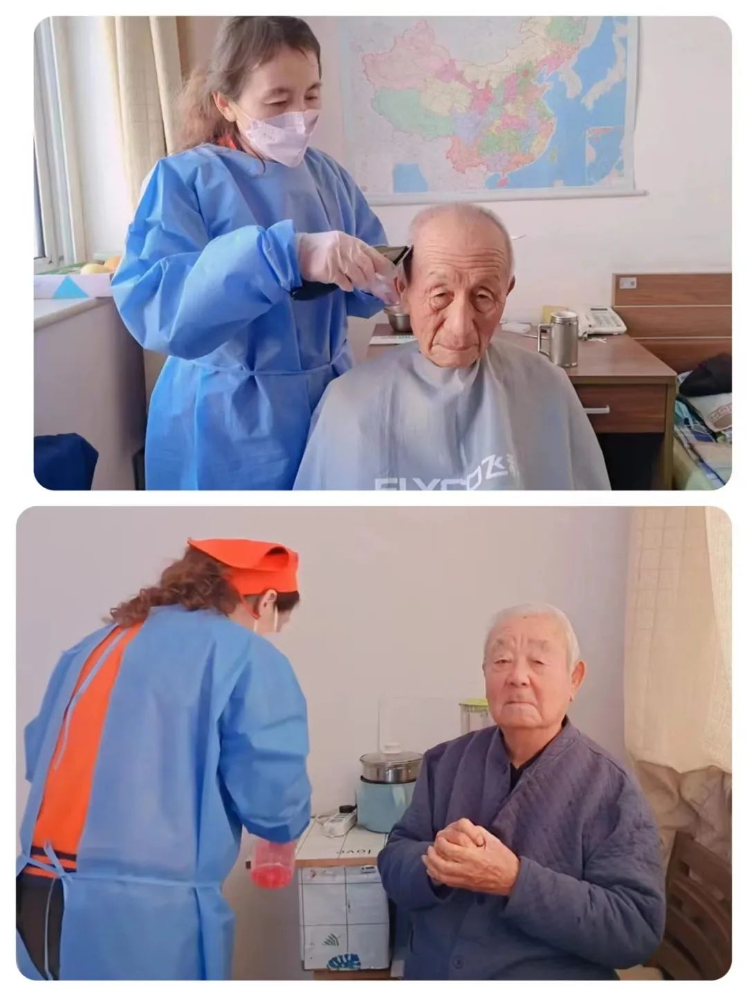 这两张照片是拍摄于2022年12月17日。新冠疫情在院内爆发的时候,当时几乎所有的师傅们都是在身体还未恢复状态中上岗。每位师傅每天进入老人房间,都要给每个地方进行擦拭消毒。雪红师傅身体刚刚好,老人们看见她就像见到了闺女,格外踏实。王爷爷说:“雪红,给我理个发吧!我的身体好多了,你帮我理完发我会更精神啦!”