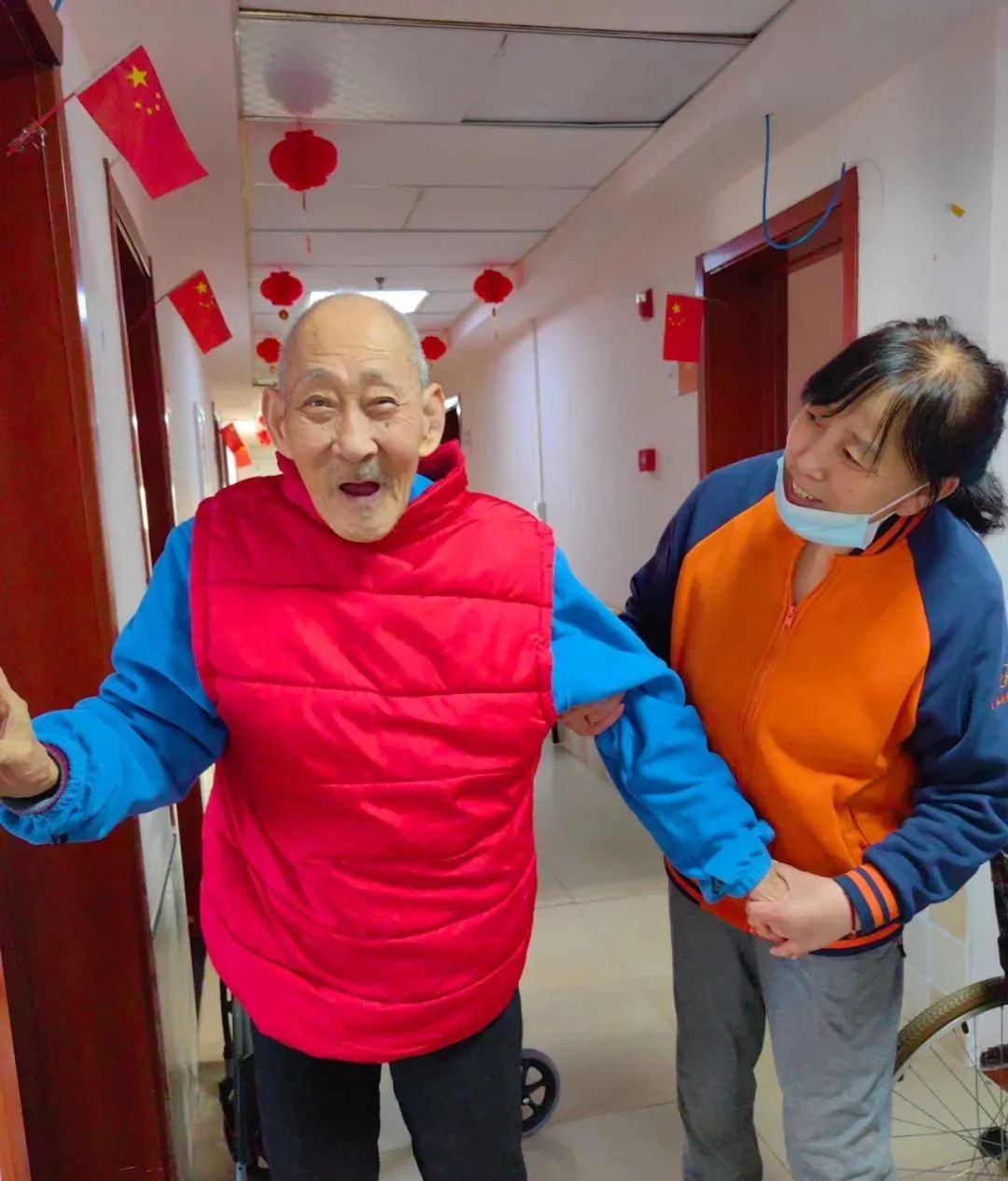 梁爷爷手老是不闲着,总是忙着解开衣服上的纽扣,或把拉链统统拉下。明明刚刚穿好衣服,眨眼就都解开了。师傅们急中生智,给他把马甲反穿着了,他的敏捷双手就无用武之地了。(拍摄时间:2023年3月5日)![]()