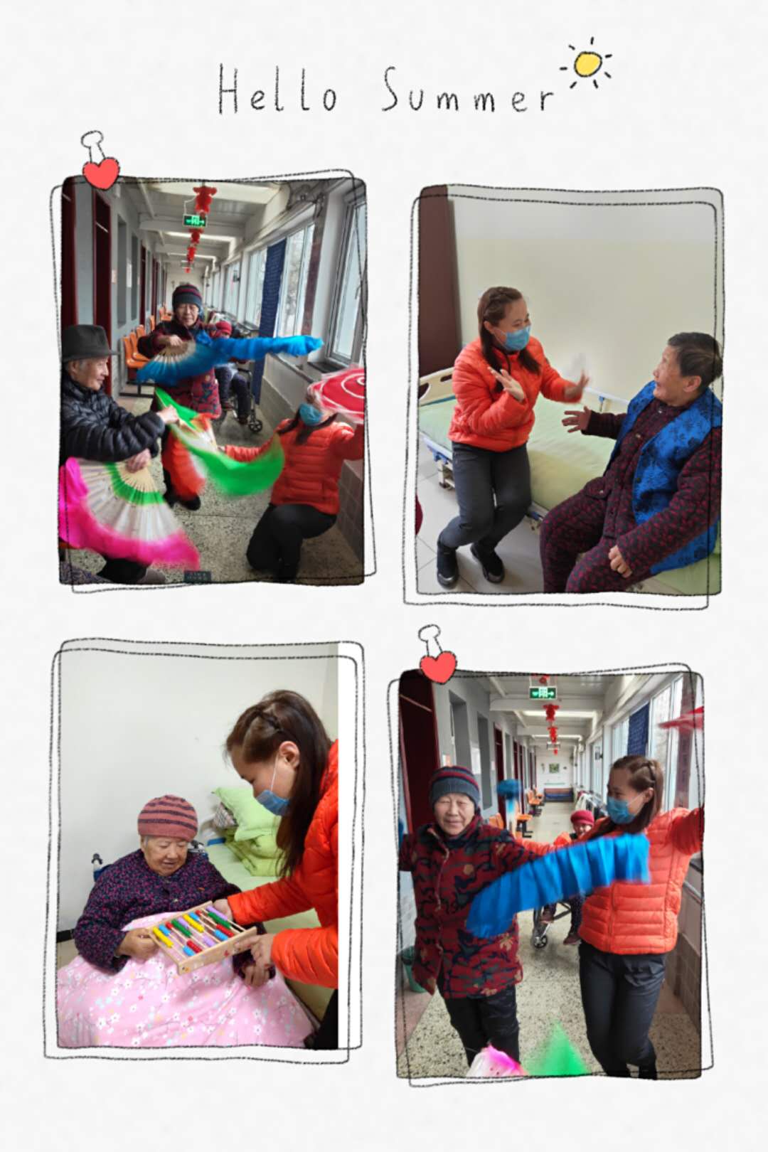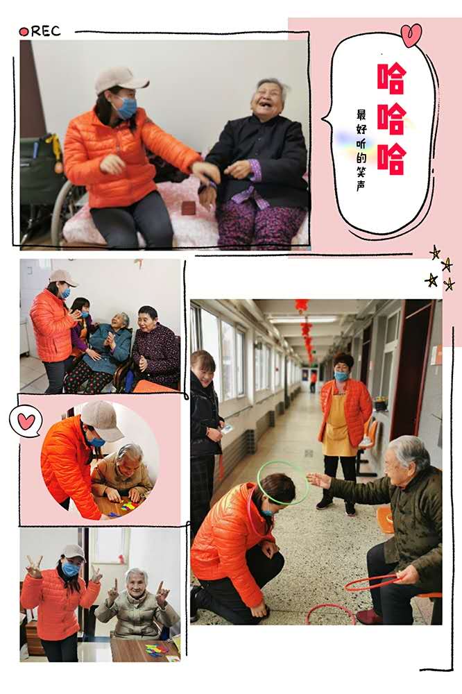 我的工作是文娱。今年遇到可怕的疫情,亲人们不能来院里看望爷爷奶奶。我每天尽可能多地给每位爷爷奶奶拍视频、拍照片,安排家属和爷爷奶奶们以视频的方式相聚。爷爷奶奶们在非常时期的非常情绪,大家都当成头等大事来对待。