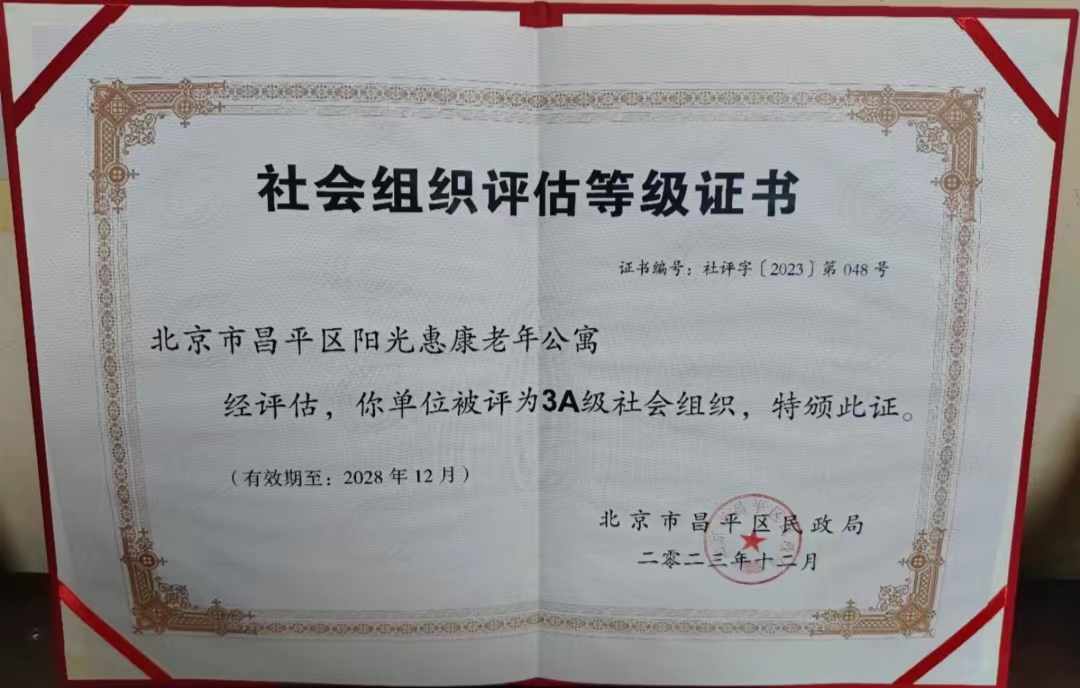 千禾连锁养老十三陵院(北京昌平区阳光惠康老年公寓),经过北京市昌平区民政局评估小组公开、公正的审查考核,获评3A(AAA)级社会组织,获颁3A级牌匾。