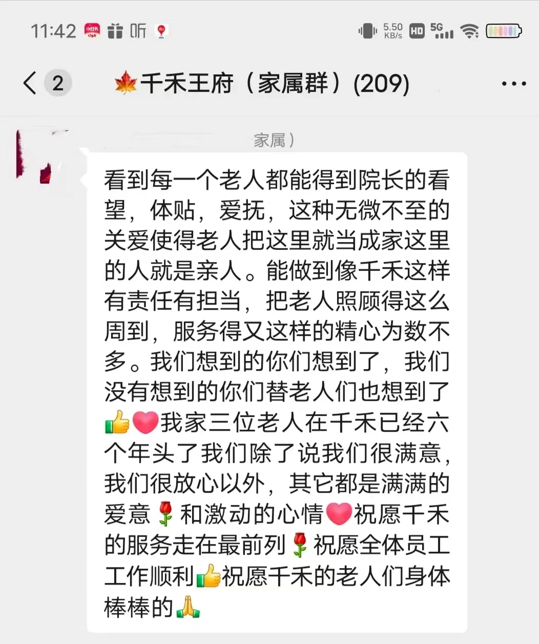 千禾连锁养老自2008年成立以来,始终重视企业文化,倡导有信念的服务。千禾企业的核心理念是“老人至上,员工为本,企业为家,营造一个充满爱的家,让老人舒心满意,让家人放心无忧,让员工开心快乐”,这也是实现“只做让老人开心的养老,让老有所依、孝有所托”的使命、完成企业愿景的重要基础和支撑。在家属群里,千禾养老各院得到了不少家属发自内心的认可。当我们每次收到家属的认可时,都特别欣慰。作为千禾人,我们时刻铭记着家属们的信任,尽心尽力地为长辈提供最优质的养老服务。希望这里不仅是长辈们的居所,更是一个家。