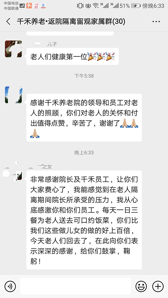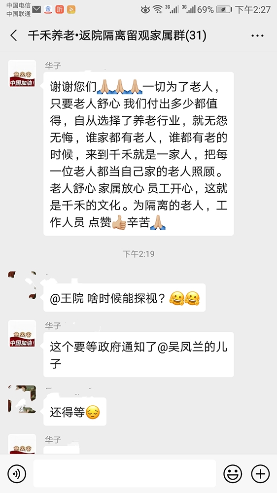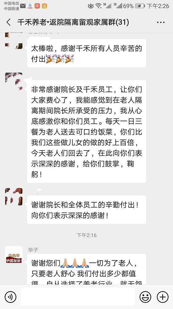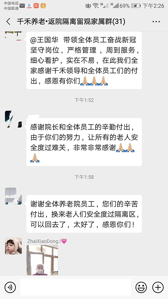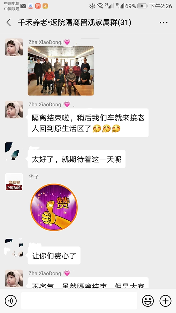 春节回家过年的老人,最近陆续返院。经过层层把关,爷爷奶奶最终在院里安全渡过十四天隔离期。家属每日都在群里遥望关注动态。隔离结束,工作人员把爷爷奶奶平安送回到原来的生活区。我们隔着屏幕为大家庆贺!谢谢爷爷奶奶们的配合,真诚感谢家属们的支持!