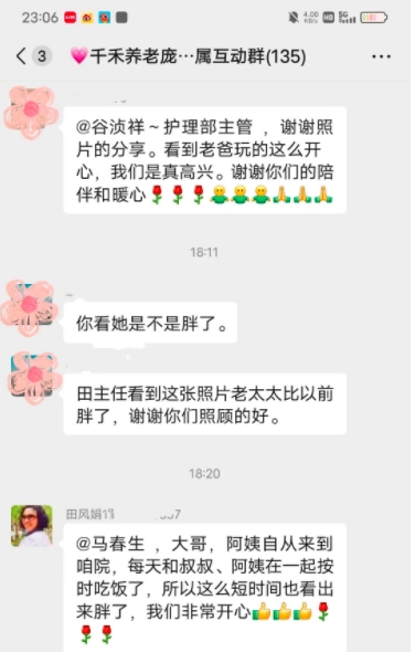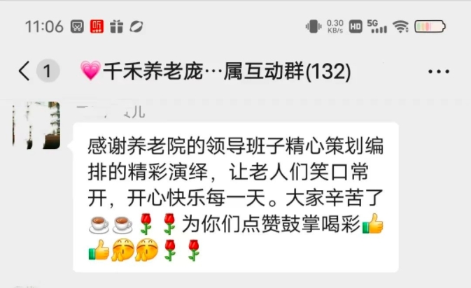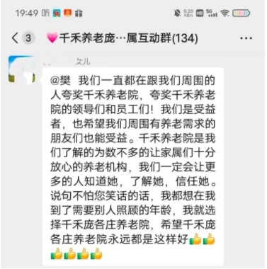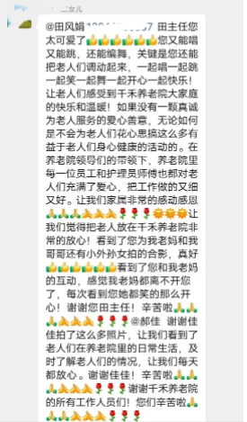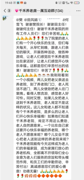 住在养老院的老人,真正需要的是什么?在中国老龄化日趋严重,“高龄少子”家庭结构为主的当下,选择养老院养老成为老人们晚年无法回避的养老方式之一。看到家属群里家属的留言,小编既欣慰又心酸,欣慰的是千禾连锁养老得到家属真诚的认可,心酸的是家属提到的一个社会案例,也带给我们一个思考,老人在养老院生活如何赢得家属的认可?首先,老人走过了风风雨雨,他们承受了无数的压力和挑战,带大了儿女子孙,现在是他们享受晚年生活的时候了。看到老人们在养老院每天开心,是所有家属们的希望。所以,在养老院里,我们不仅要满足老人们的物质需求,也要关心他们的精神需求,让他们感受到温暖和快乐。