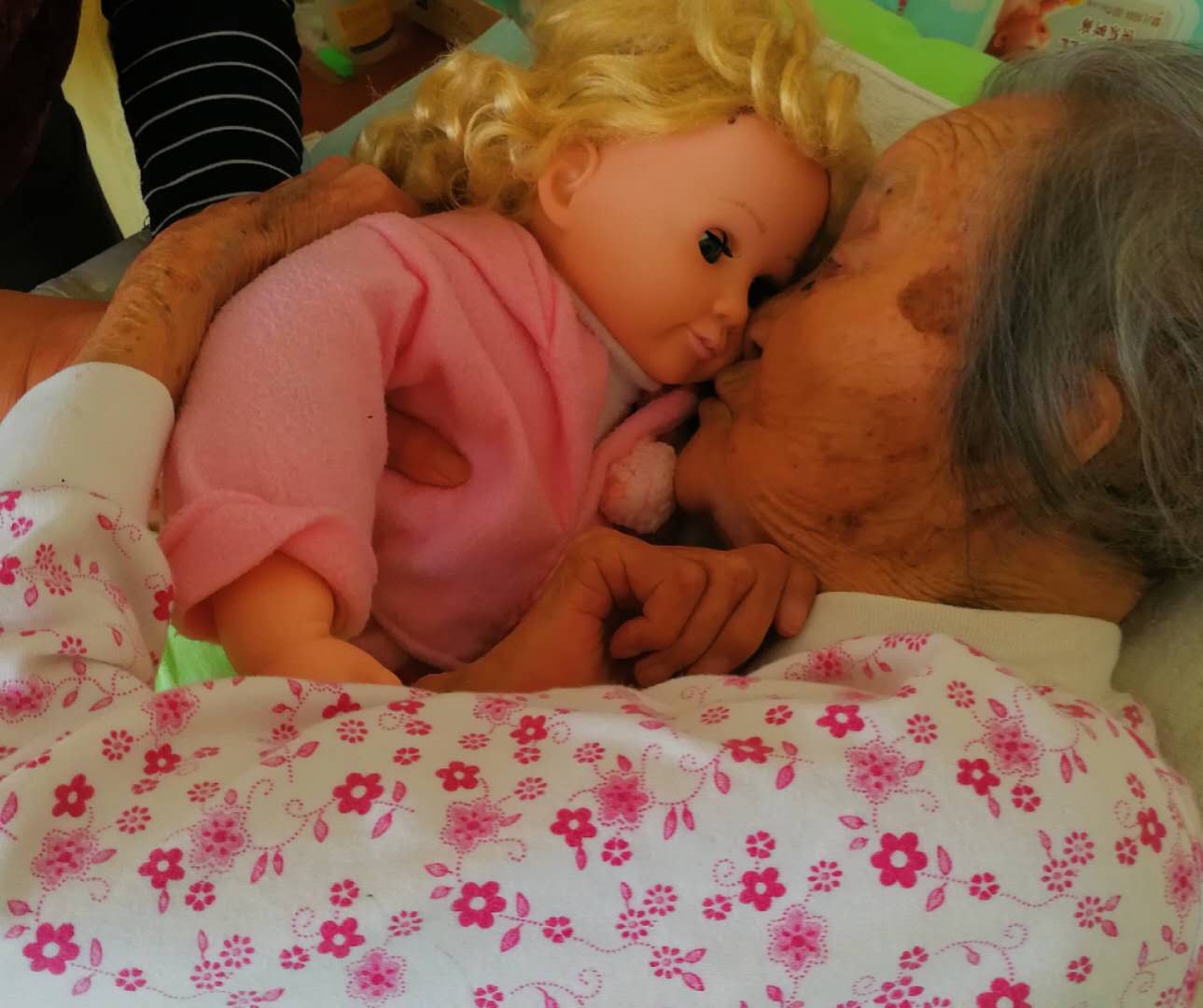 张奶奶有时睡着,有时抱着洋娃娃哭,把不在身边的老伴、儿女的名字轮流叫一遍,一边叫一边哭。张女士握着张奶奶的手安慰说:“他们去天上给您盖房子了。过几天孙子孙女就来看您了,给您带好吃的呢,咱不哭了,您高兴了,我们才能高兴呢!”张女士拍着洋娃娃:“您看您的孙子还陪着您呢。”张奶奶一边悲伤地哭,一边又爱怜地摸着洋娃娃像摸着自己的孩子开始操心:“娃娃的脚凉,衣服要穿好。”